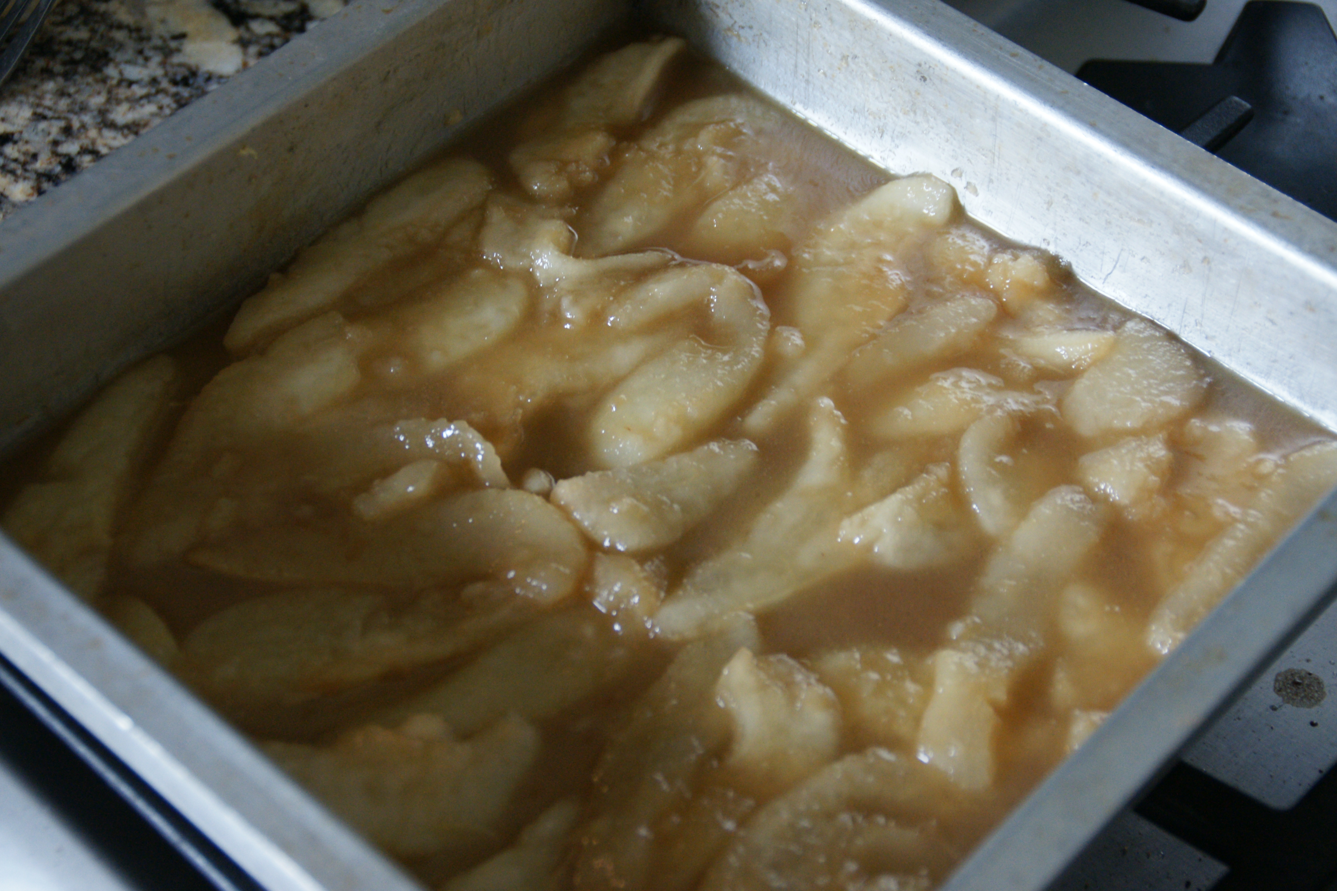 Cook until pears have softened.  It will look like there’s a lot of liquid, but that’s OK.  Arrange the pears (or not– I just make sure they’re evenly spread across the bottom of the pan) and set aside pan while you make the gingerbread batter.