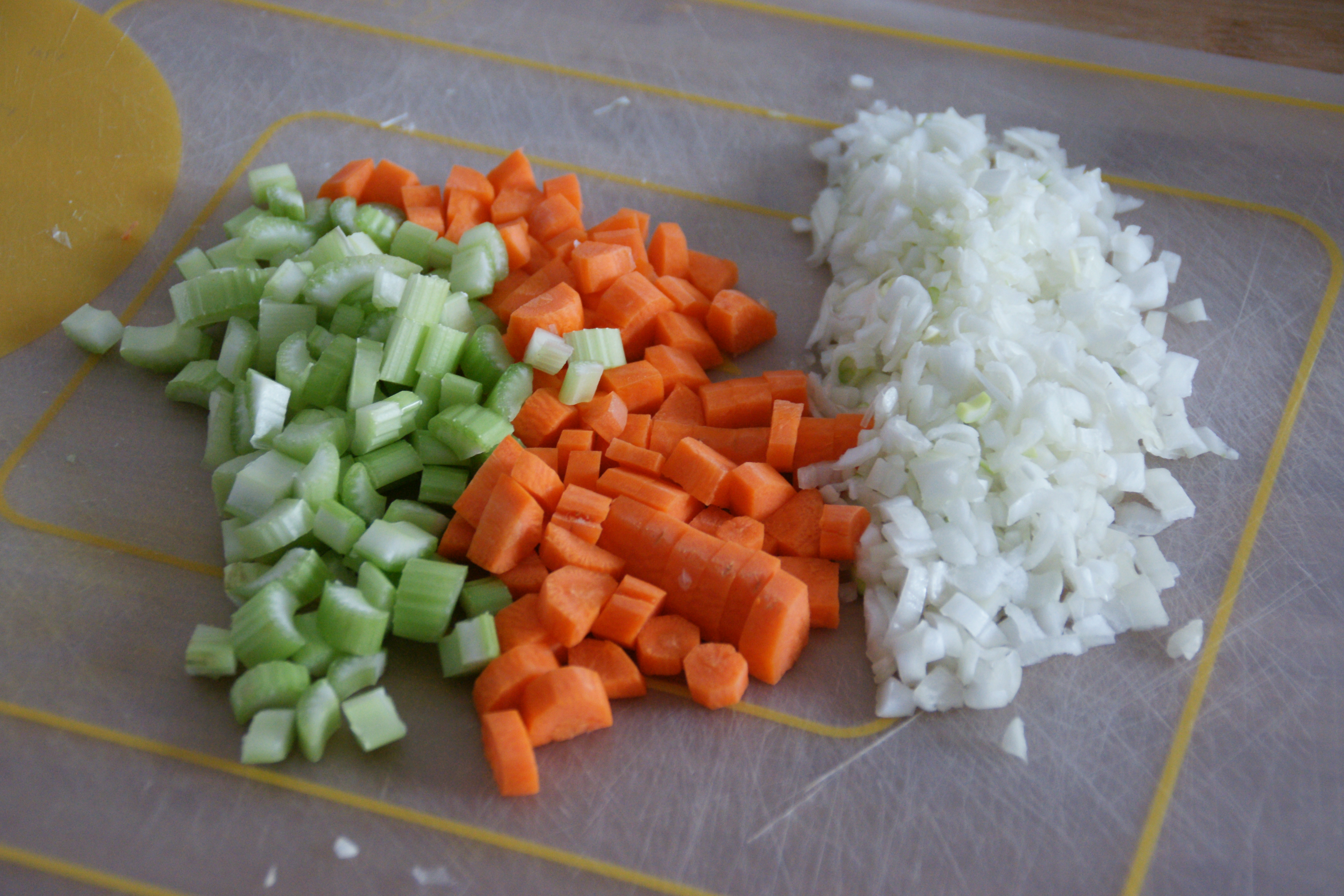 Preheat the oven to 425 degrees F. Chop your vegetables; this trinity is also known as a mirepoix– a classic flavor base.