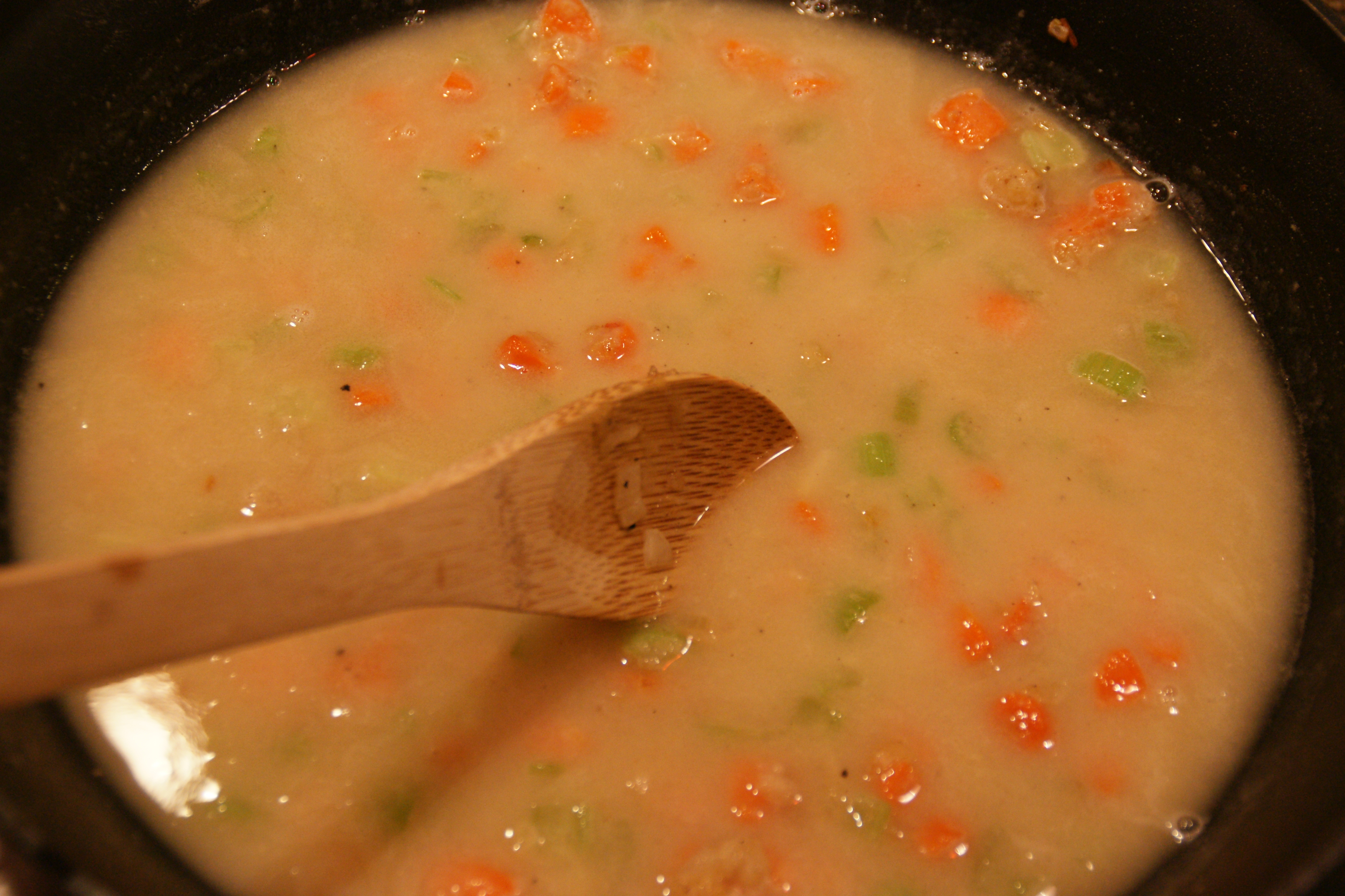 Add the chicken broth slowly and stir, blending well. When you first add the broth, it may look like a big clumpy mess, but just keep adding the broth and stirring. It will smooth out once you’ve added all the liquid.