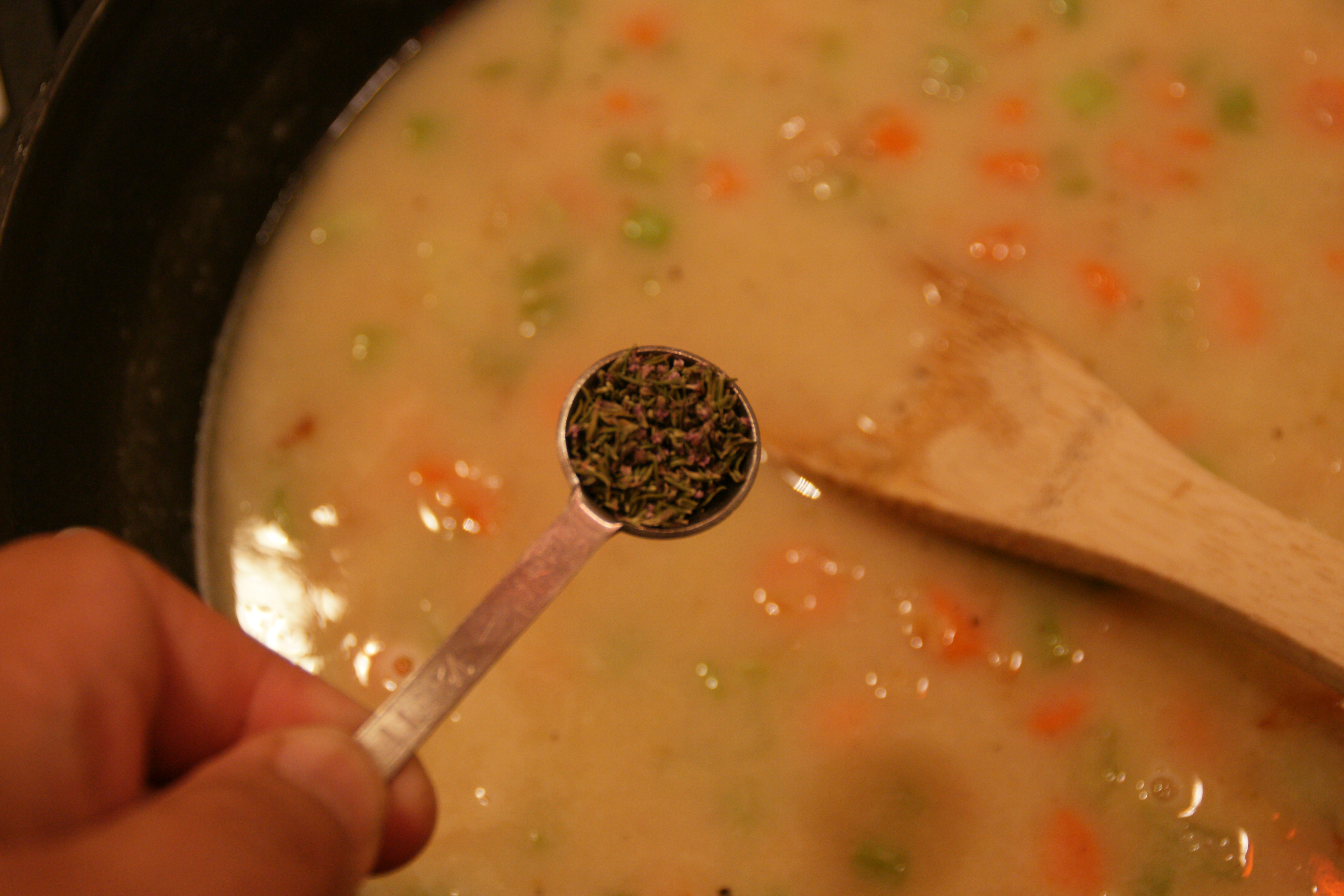 Add the thyme and let the mixture come to a gentle simmer. As it simmers, the sauce will thicken more.