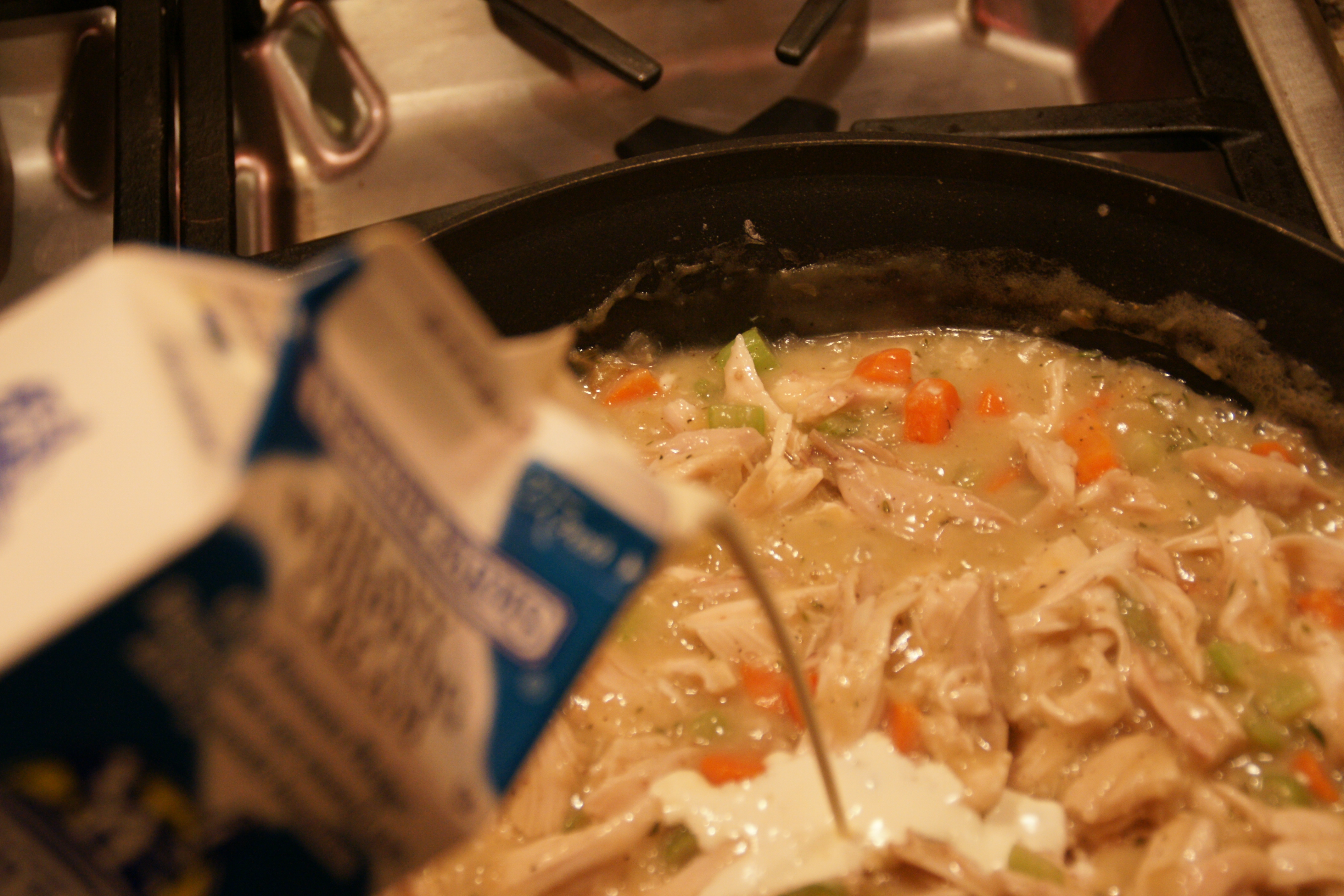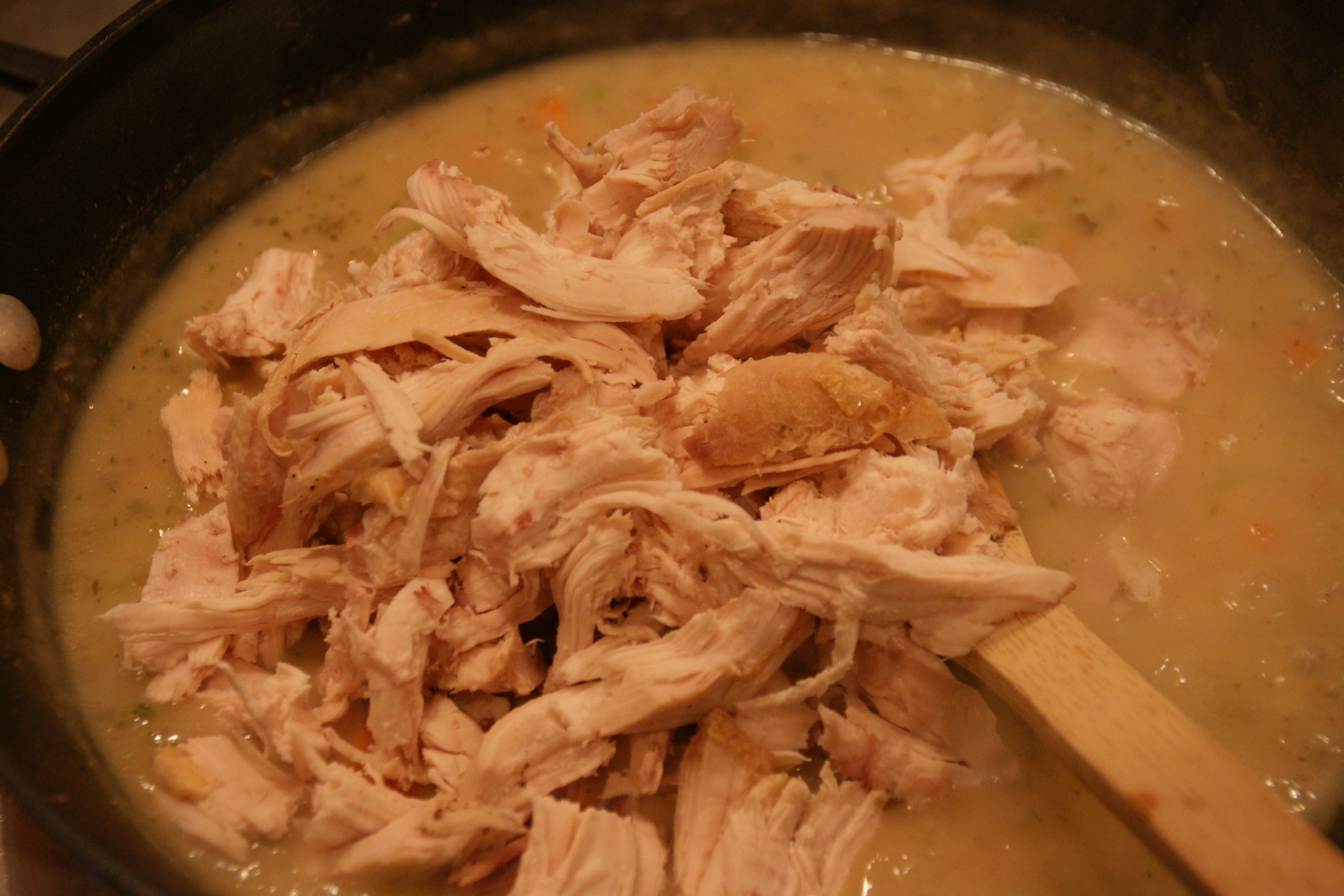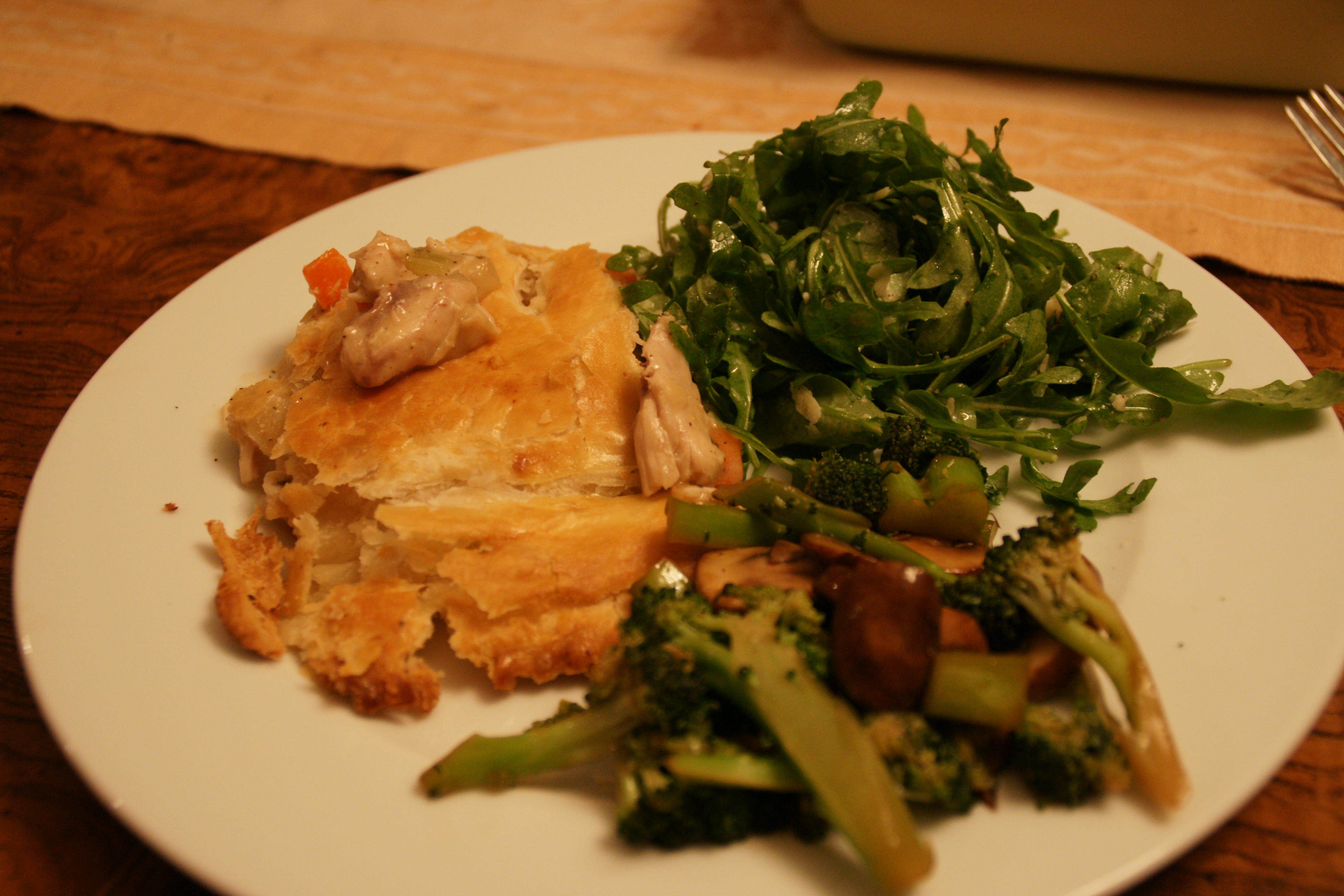Tonight I decided to make chicken pot pie with the leftover chicken– NOT the reduced-fat recipe I previously posted here. I mean the REAL THING: fresh vegetables and chicken in a rich sauce based on a butter and oil roux and a dash of heavy cream. Let’s not forget the top– no store-bought reduced fat biscuits or even buttered sandwich bread (one of my tricks when I don’t feel like making pie dough), but a buttery, golden brown, flaky shell. A sure cure to beat away the winter chill!