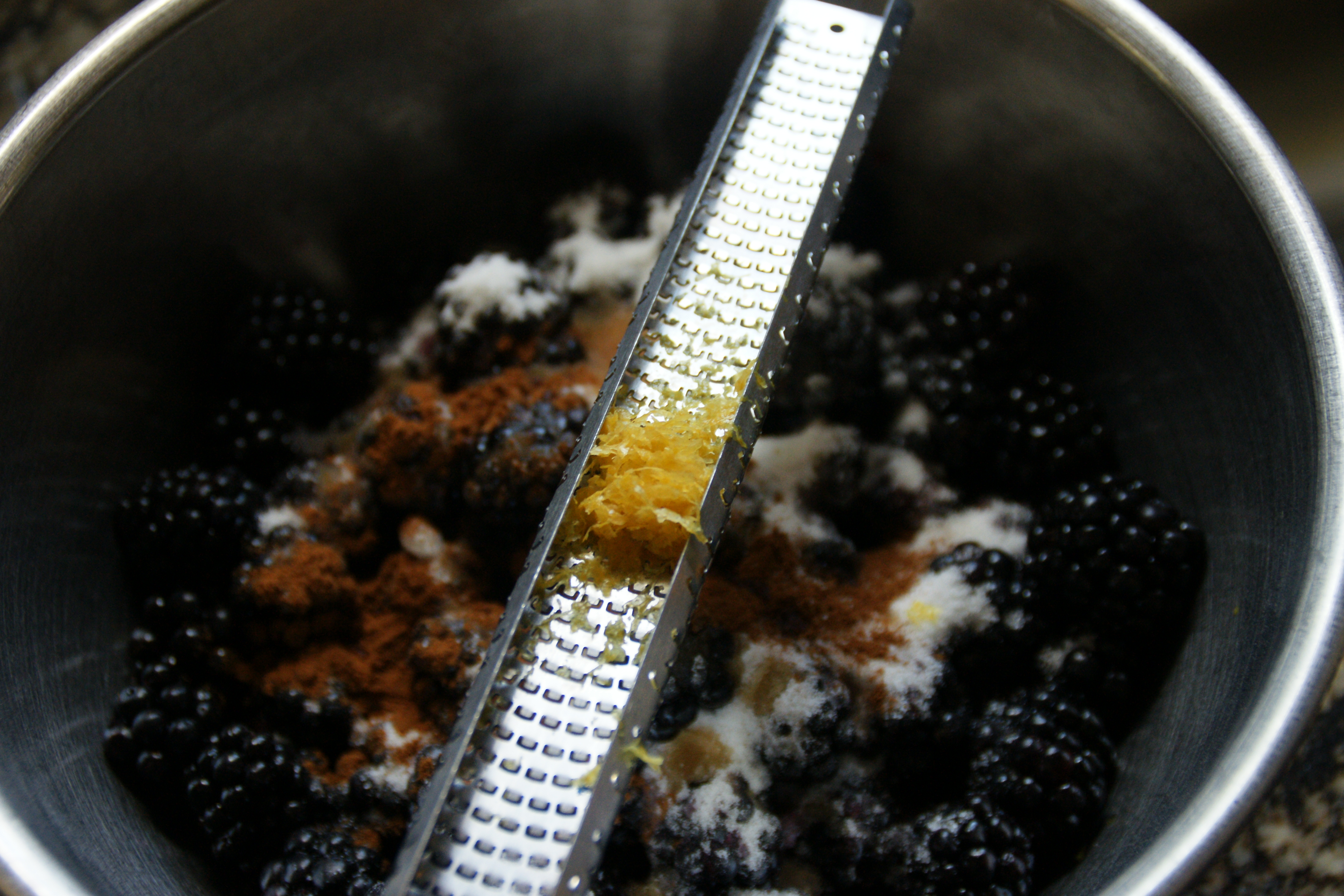 Tapioca flour binds the berry juices and fruit without producing any of that goo. The first time I made this pie, I didn’t have tapioca flour so I ground tapioca pearls in my repurposed coffee-grinder spice mill, and was quite nervous when I saw the little white bits among the blackberries. Cutting into that first pie, however, we were all pleasantly surprised to see a thick blackberry filling without any accompanying glop. Success and the beginning of myriad new fruit pie adventures.